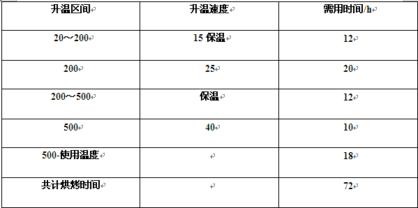 新型干法窯的預熱系統采用大量耐火澆注料,又使用組成單元材料熱導率不一的復合襯里,且面積和總厚度很大,為確保脫去附著水和化學結合水兩階段的襯里*,在常溫下24h的水硬性澆注料襯里凝固期內不準加熱烘烤。在襯里表面溫度為200攝氏度和500攝氏度時還應保持一定時間的溫度。對只使用澆注料的襯里,其具體升溫見表,如下: